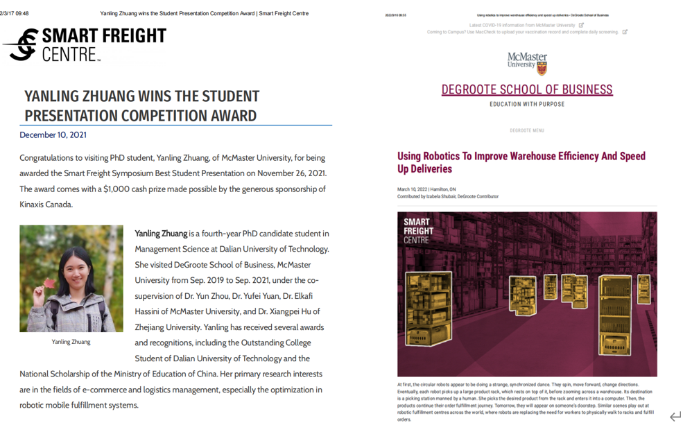 Zhuang Yanling visited DeGroote School of Business, McMaster University from Sep. 2019 to Sep. 2021. Her primary research interests are in the fields of e-commerce and logistics management, especially the optimization in robotic mobile fulfillment systems.
